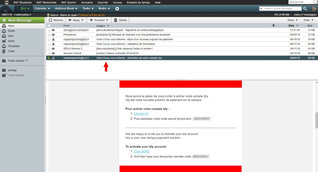 ③「Votre Crous vous informe - Activation de votre compte Izly」というタイトルのメールが届いているので開くと、仮のパスワードが配布されています。