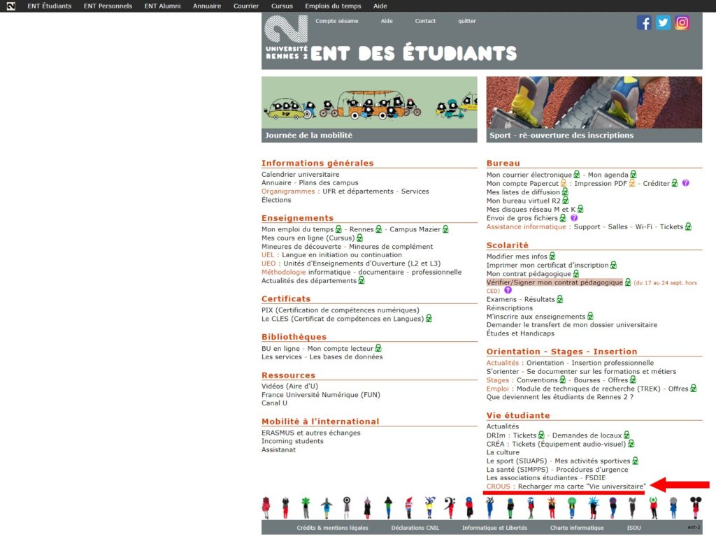 ①レンヌ第二大学の学生向けのHPから、右下の『CROUS :Recharger ma carte "Vie universitaire"』をクリックをします。