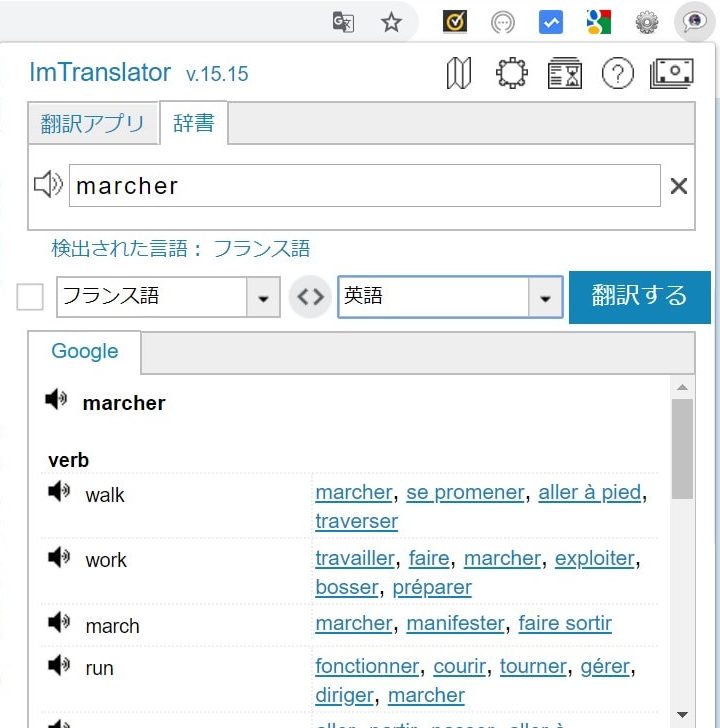 アイコンをクリックすると辞書・翻訳機能が現れるので、任意の文字を打ち込んで調べることができます。