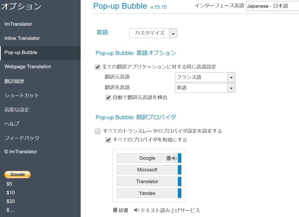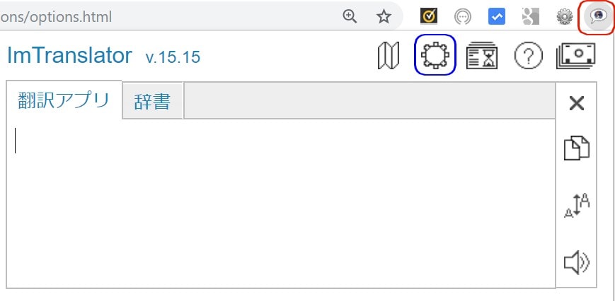 地球儀が書かれた吹き出しのアイコンをクリックするとImTranslatorが起動するので、設定ボタンをクリックしてください。(青枠で囲まれたアイコン)