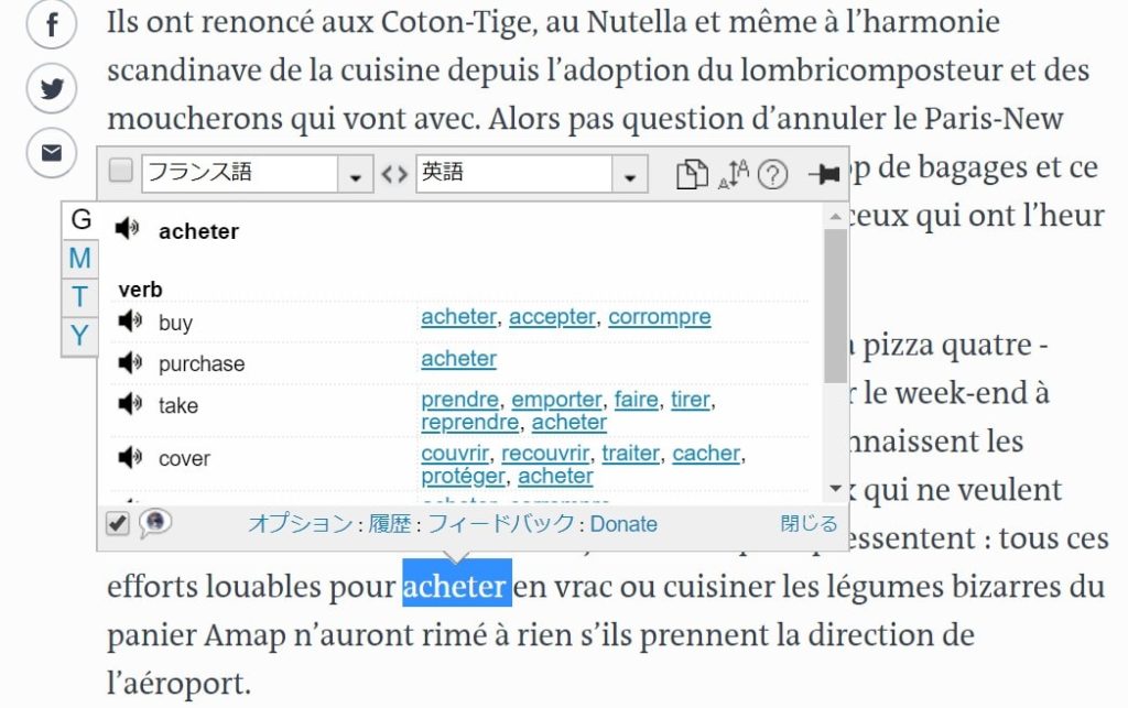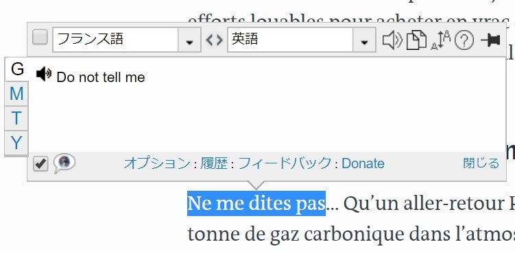 文中の文章をポップアップ表示で訳してくれる翻訳機能